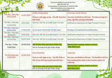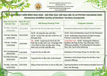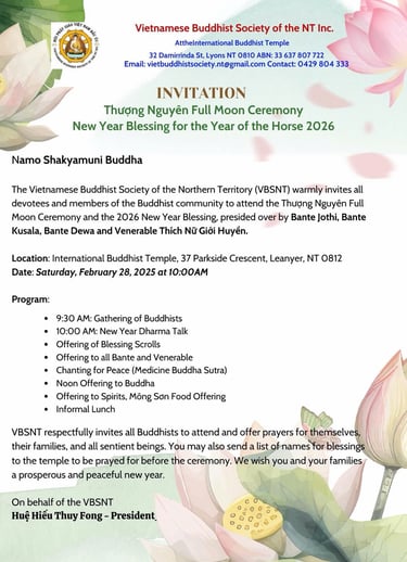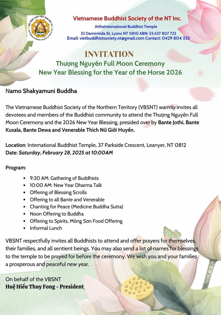 The Vietnamese Buddhist Association of Northern Australia sincerely hopes for your presence, which will further enhance the solemnity and warmth of the spiritual assembly.
