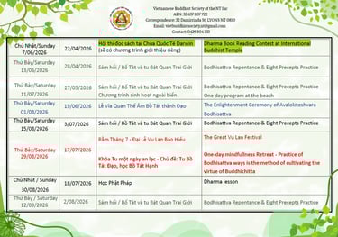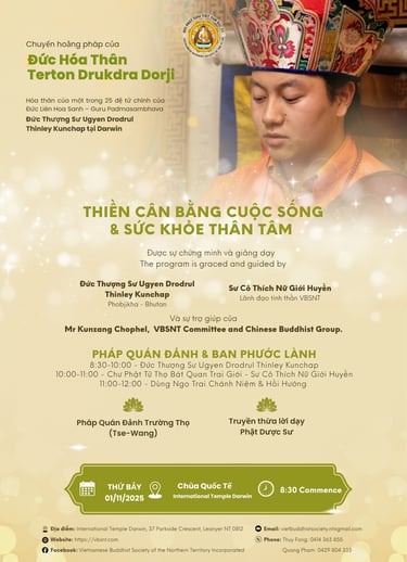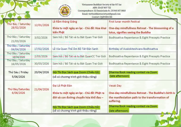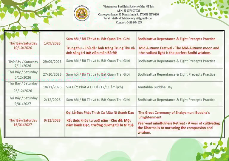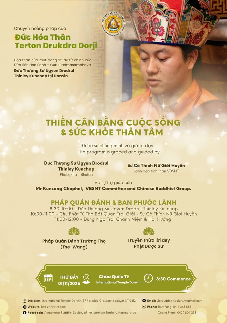 On Saturday, November 1st, 2025, the Vietnamese Buddhist Society of the NT (VBSNT) will host our monthly meditation and Dharma practice day with the theme: βMeditation β Balancing Life and Nourishing Body & Mind.β