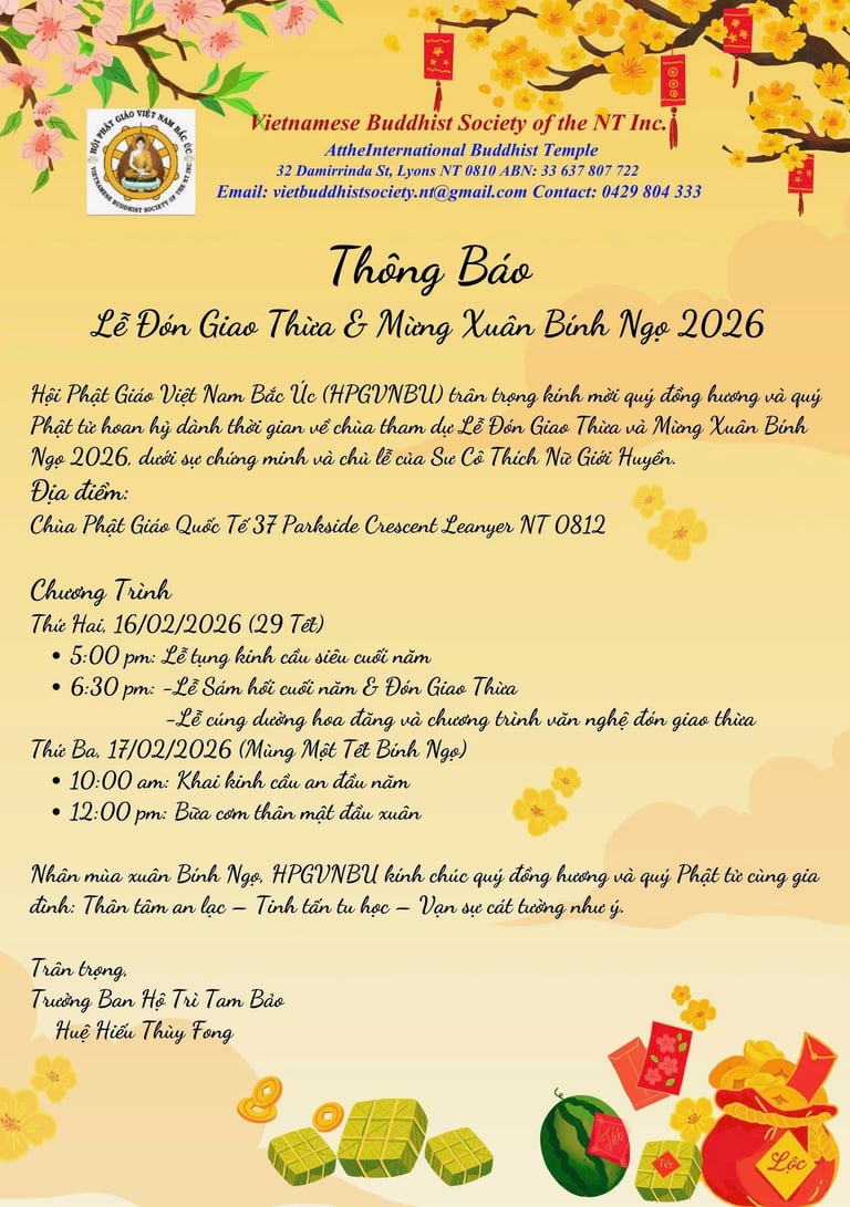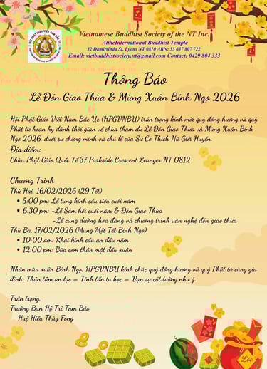 Nhân mùa xuân Bính Ngọ đang trở về, Hội Phật Giáo Việt Nam Bắc Úc (HPGVNBU) trân trọng kính mời quý vị hoan hỷ trở về chùa tham dự Lễ Đón Giao Thừa và Mừng Xuân Mới.