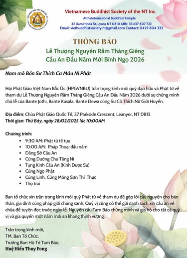 Buổi lễ sẽ được cử hành dưới sự chứng minh của Sư Cô Thích Nữ Giới Huyền. Đây là dịp để chúng ta cùng thắp nén tâm hương tưởng niệm, sám hối, cầu an và khởi đầu năm mới với tâm an lạc, thân khỏe mạnh.