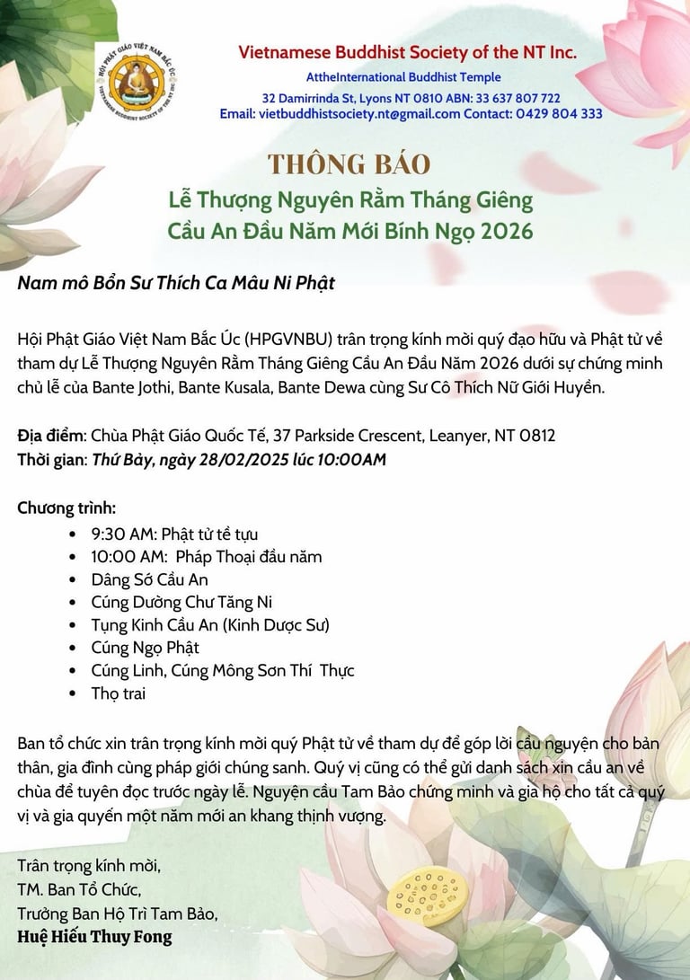 Thông Báo thay Thư Mời tham dự Một Ngày Tu An Lạc & Lễ Vu Lan Báo Hiếu (6-7/9/2025 ) tại Chùa Quốc Tế, Darwin, Bắc Úc 🙏🙏🌼🍁🌺🍀🌹🥀🌷🌸🏵️🌼🍁🌺🍀🌹🥀🌷🌸🙏🙏